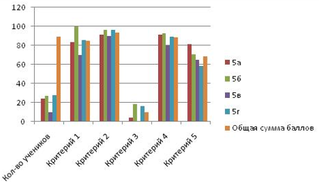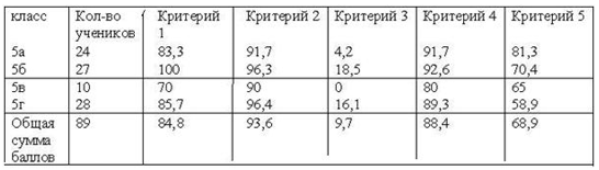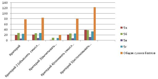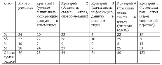Для обобщения полученных данных использовался статистический критерий. В результате анализа данных констатирующего эксперимента нами были выделены пять групп учащихся с точки зрения умения работать с текстом. Всего работу писало 89 учеников. Максимально возможный балл, который можно набрать – 7. Учащиеся первой группы (умение вычитывать информацию данную в явном виде) - набрали 78 баллов (84,8 %) от общего числа школьников; вторая группа (объяснять смысл слова, словосочетания) - набрала 84 балла (93,57%) от общего числа школьников; третья группа (вычитывать информацию, данную в неявном виде) - набрала 21 балл (9,7%) от общего числа школьников школьников; четвертая группа (понимать смысл текста в целом (главную мысль) – набрала 80 баллов (88,4%) от общего числа школьников; пятая группа (истолковывать текст (через творческий пересказ) – набрала 123 балла (68,9%) от общего числа школьников.