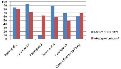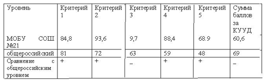 Сравнение средних данных уровней сформированности КУУД учащихся МОБУ СОШ №21 г. Якутска и средний общероссийский уровень (в%)