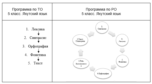 Принцип РО обучению языку – это ведение учителя своих учеников к теории языка на основе жизненных умений и знаний [Репкин В.В. Экспериментальная программа развивающего обучения русскому языку 5–9 классы. Томск, 1997]. Как видно на таблице, программа РО по якутскому языку в 5 классе начинается с темы «Речь.Высказывание». То-есть, обучение начинается с того, что знакомо детям в повседневной жизни – с разговорной среды, которое создает условие учебного процесса основываясь на этом, учитель ставит цель в ходе обучения: улучшить, обновить привитые ребенку умения и навыки, добиться при этом, чтоб он устно и письменно связно, образно излагал мысль. Если проследить по схеме, то видно, что учитель свою цель достигает, переходя планово от одного этапа к другому этапу, установив обратную связь.