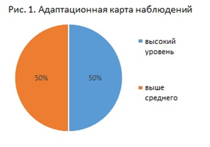 Уровень адаптация учеников был определен по методике Э.М. Александровской и Ст. Громба (модифицированной Еськиной Е.С., Больбот Т.Л.) по 4-м критериям: 1) эффективность учебной деятельности; 2) усвоение нравственно-этических норм и школьных норм поведения; 3) успешность социальных контактов; 4) эмоциональное благополучие. Результаты наблюдения за адаптацией и эффективностью учебной деятельности учащихся показаны на рисунке 1. Как видно из графика 50% учащихся имеют высокий уровень адаптации, 50 % - уровень адаптации выше среднего.