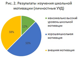 Изучение мотивационной сферы школьной мотивации по Лускановой показали (рис.2): Максимально высокий уровень – 12%; Хорошая школьная мотивация – 50%; Внешняя мотивация – 38% учащихся.