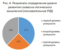 Результаты определения уровня развития словесно-логического мышления по Переслини Л., Фотекова Т. показывают, что у 38% учащихся третий уровень; 37% - первый уровень; 25% - второй уровень успешности.