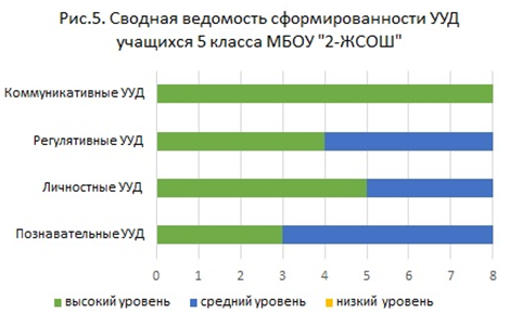 тывают видимой сложности в общении с педагогами, старшими школьниками, стараются выполнять предъявляемые им требования, но успеваемость пятиклассников ухудшились в начале года были два отличника, пять хорошистов в классе, а по результатам третьей четверти – два отличника и два хорошиста, наблюдается низкая техника чтения. В целом, сформированность универсальных учебных действий у учащихся 5 класса МБОУ «2-ЖСОШ», можно показать следующим образом (рисунок 5):