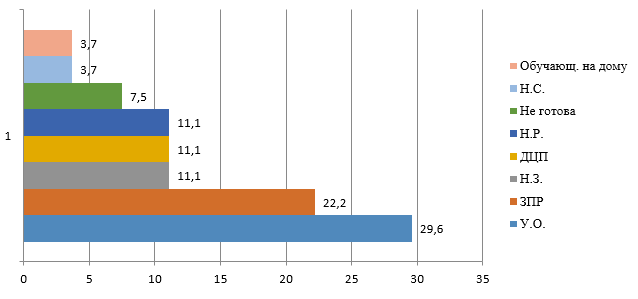 «С какими категориями детей с ОВЗ Вы готовы работать?»Более 50% педагогов, отвечая на данный вопрос, указали на обучающихся, имеющих отклонения в интеллектуальной сфере (умственная отсталость, задержка психического развития), что, вероятнее всего, связано с распространенностью этих категорий детей. В меньшей степени педагоги готовы работать с детьми, имеющими нарушения зрения (Н.З.), речи (Н.Р.), нарушения функций опорно-двигательного аппарата (ДЦП), слуха (Н.С.) Только 7,5 % высказали идею о своей неготовности к работе с лицами с ОВЗ. Никто из педагогов не выразил готовности к работе с лицами с расстройствами аутистического спектра (рис. 1).