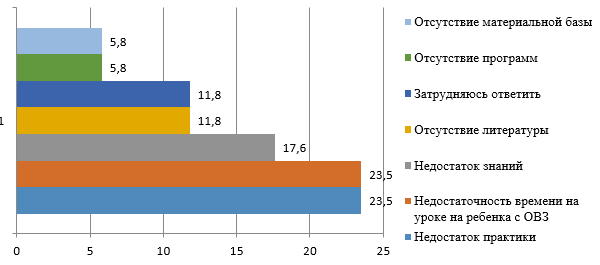 Еще одним вопросом, позволяющим выразить свое отношение к инклюзии, стал вопрос о причинах неготовности к обучению лиц с ОВЗ. По мнению учителей эти причины заключены в недостатке практики и знаний, в трудностях организации урока, в отсутствии методической литературы, программ и материальной базы (рис. 2).