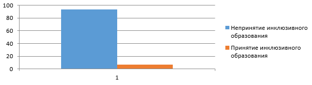 Непринятие идеи инклюзивного образования большинством респондентов возможно объясняется наличием сложившегося стереотипа и свидетельствует либо о недостаточности понимания инклюзивного процесса, либо о трудностях, возникающих при организации условий для инклюзивной практики. И только 6,7% респондентов поддержали идею инклюзивного образования.