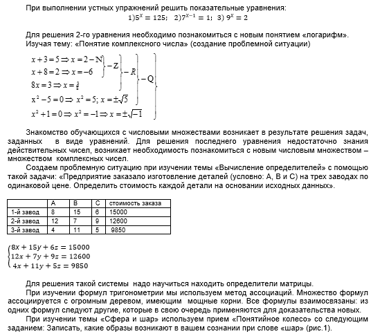 Стадия вызова. Любой урок начинается с актуализации знаний, т.е. подготовки учащихся к восприятию нового учебного материала. Урок математики можно начать с задачи - шутки, логической разминки, мозгового штурма, устных упражнений на повторение темы, создания проблемной ситуации, применения аналогий и т.д. Например, для определения темы урока «Сфера и шар» можно загадать загадку: