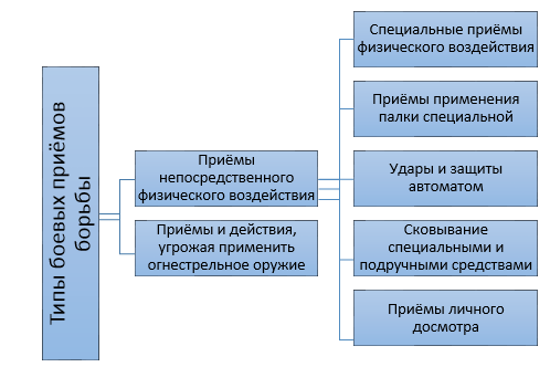 Первый тип боевых приемов борьбы включает в себя приемы непосредственного физического воздействия с применением специальных средств и огнестрельного оружия, приемы сковывания с применением специальных и подручных средств, приемы личного досмотра. Второй тип – приёмы и действия угрожая применить огнестрельное оружие.