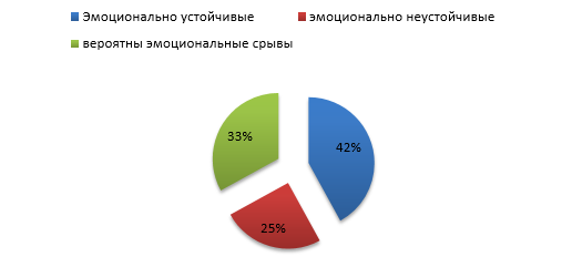 Исследование проводилось с использованием адаптированной методики «Прогноз», разработанной в ленинградской военно-медицинской академии им. С.М. Кирова и предназначенной для выделения лиц с признаками нервно-психической неустойчивости и риска дезориентации в стрессовых ситуациях, включающей 84 вопроса [2]. В тестировании на определение эмоциональной устойчивости принимало участие 60 курсантов. По результатам тестирования в группе риска находится 15 курсантов, у 19 человек в экстремальных ситуациях вероятны эмоциональные срывы. Эмоционально устойчивыми являются 26 курсантов (Диаграмма 1).