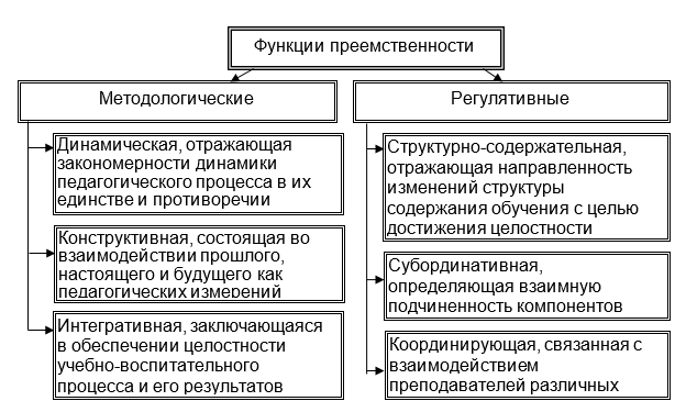 Выделяют методологические, отражающие теорию организации процесса обучения, и регулятивные, касающиеся вопросов его реализации, функции преемственности. Основные из них представлены в схеме на рисунке 1.