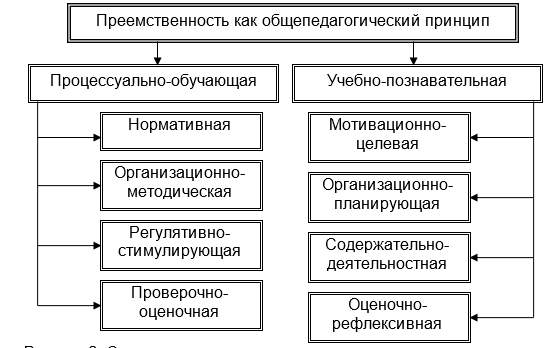 В современной дидактике, как отмечалось выше, преемственность трактуется с одной стороны как принцип обучения, реализующий социализирующую, стимулирующую, интегрирующую, эвристическую, направляющую функции; с другой стороны, как педагогическая система, состоящая из двух структур: процессуально-обучающей преемственности и учебно-познавательной преемственности (рисунок 2) [2].