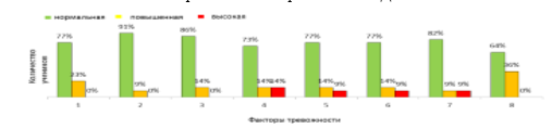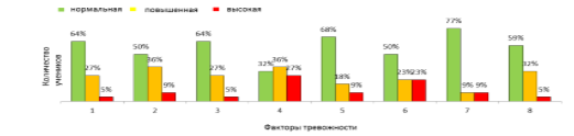 Для определения факторов тревожности учеников мы использовали методику диагностики уровня школьной тревожности Л.Дж. Филлипса [5]. Результаты исследования представлены ниже (рисунок 1, 2).