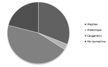 Из всей выборки в 29 человек 9 – потенциальные жертвы кибeрбуллинга, что составляет 31% из общего числа опрошенных. 3% являются агрессорами, 45% свидетелей и 21% не выявили причастности к кибeрбуллингу в какой-либо роли. Это наглядно указано на рисунке 1.