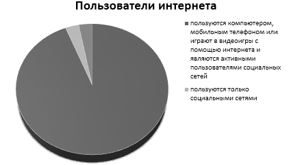 93 % опрошенных пользуются компьютером, мобильным телефоном или играют в видеоигры с помощью интернета и являются активными пользователями социальных сетей. 3% пользуются только социальными сетями, 4 % не сидят в социальных сетях, но играют в видеоигры с помощью интернета. Эти данные отражены в рисунке 2.