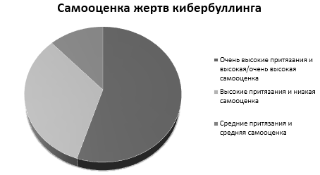 Анализируя полученные результаты, мы выяснили, что у 55% жертв кибeрбуллинга завышенные притязания и высокая самооценка, 33% имеют высокие притязания и заниженную самооценку, 12% имеют средние притязания и среднюю самооценку. Это визуально раскрыто на рисунке 4.