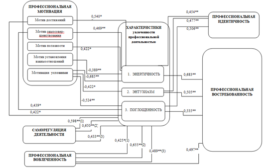 Следовательно, первыми признаками субъекта профессиональной увлеченности выступают интринсивная мотивация и профессиональная идентичность. Эти связи проявлены, эксплицированы, но не отражают всех аспектов формирования профессиональной увлеченности субъекта.