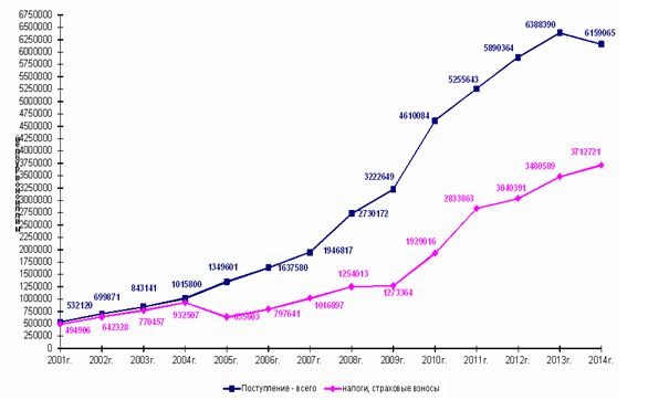 Поступления от плательщиков страховых взносов из числа самозанятого населения в 2016 г. определяются в фиксированном размере исходя из минимального размера оплаты труда (с 01.01.2016 г. МРОТ - 6204 руб.) и тарифа 26%, что составляет 19 356,48 рублей, а также 1% с суммы дохода свыше 300 тыс. руб. с установлением верхней границы платежа, рассчитанного из 8 МРОТ. На рисунке 1 прослеживается положительная динамика роста поступлений в ПФ РФ.