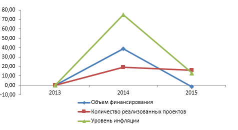 Рисунок 1. –Динамика темпов роста объемов финансирования, количества проектов ТОС и общественных организаций г.Тулы и уровня инфляции за 2013-2015 гг. в %