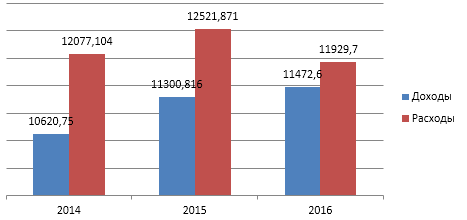 Рисунок 2. –Основные параметры бюджета МО город Тула за период 2014-2016г.г., млн.руб.