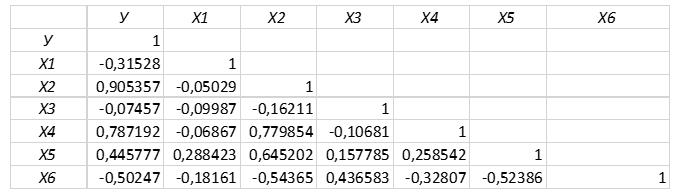 С помощью табличного редактора Excel 2013 в пакете анализа была получена корреляционная матрица и представлена в таблице 1. По этой матрице можно судить о тесноте связи факторов с результативным признаком и между собой.