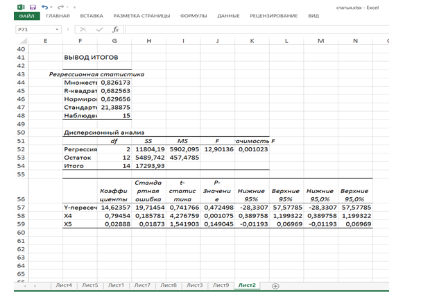 С применением редактора Excel 2013 в пакете анализа были получены результаты регрессионного анализа, которые представлены на рисунке 4.