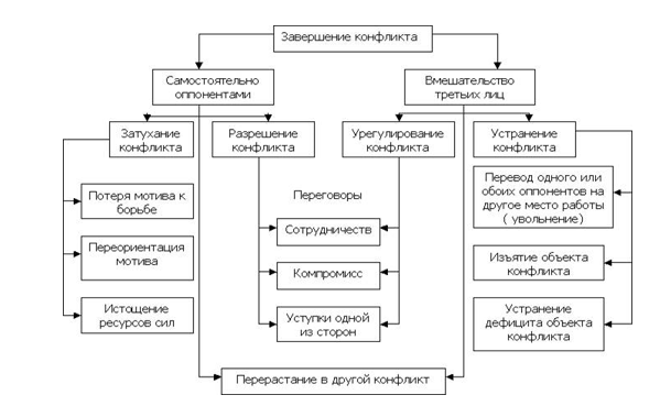 Также необходимо знать формы завершения конфликта. Несмотря на многообразность и многовариантность конфликтов в их развитии, существуют общепринятые формы их разрешения (см. рисунок 2).