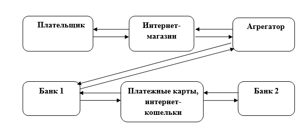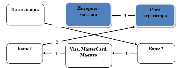 На рисунке 3 изображена схема проведения расчетов с использованием банковского счета агрегатора, стрелками показано движение денежных потоков начиная со счета плательщика.
