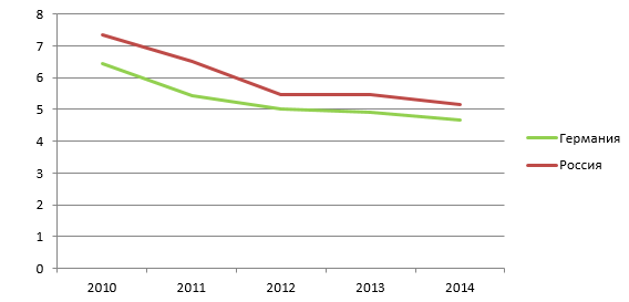 Рисунок 1 – Доля безработных в Германии и России, 2010-2014 гг.