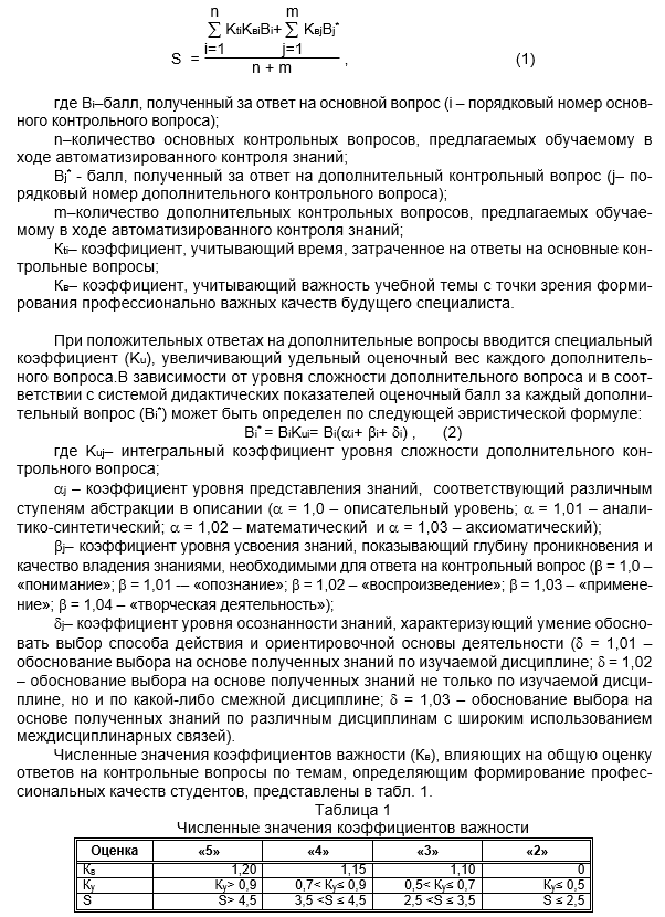 Таким образом, средний балл (S), набранный при проведении диагностирования качества обучения с помощью программы автоматизированного контроля знаний, будет определяться по формуле: