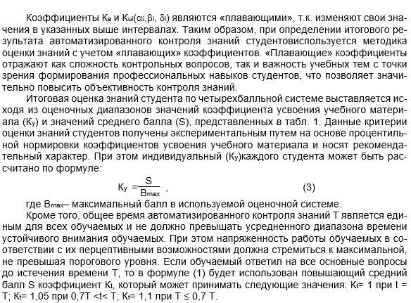 На наш взгляд, в качестве одного из методологических подходов к оценке знаний студентов может быть предложен подход на основе «плавающих» коэффициентов в автоматизированном контроле знаний студентов. Определение итоговой оценки в четырехбалльной системе, по сути, представляет собой текущий и итоговый контроль знаний. Этот процесс осуществляется автоматически с учетом оценок за выполнение контрольных заданий, полученных ответов на основные и дополнительные контрольные вопросы, общего времени, затраченного на проведение контрольных мероприятий, а также специальных коэффициентов, учитывающих важность учебных тем, влияющих на формирование профессиональных навыков студентов, и коэффициентов, учитывающих сложность дополнительных контрольных вопросов.