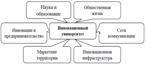 Инновационный вуз выступает индикатором научно-технического и социально-культурного развития территории. Осуществляемые в нем фундаментальные и прикладные исследования ориентируются на потребности, в первую очередь, региональных предприятий и организаций различных отраслей. Таким образом, инновационный университет может стать своеобразным импульсом инновационного развития территории [6].