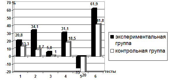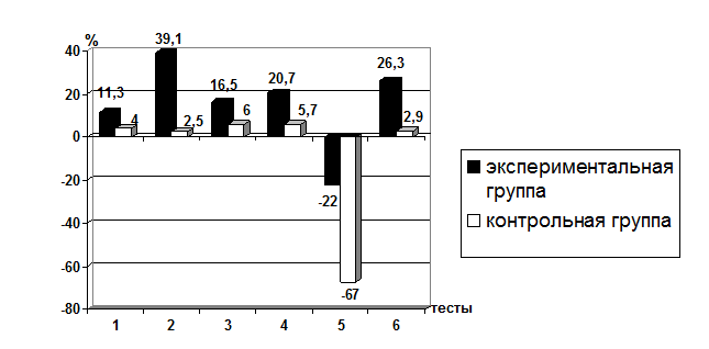 Однако, следует отметить, что если сравнить темпы прироста значений, полученных в экспериментальной и контрольной группах, то в экспериментальной они превышают темпы прироста показателей в контрольной группе.