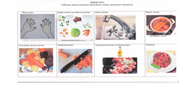 приготовления салата. На схеме обозначены компоненты трудового процесса от целеполагания до получения результата труда. Схема или модель помогает закрепить знания о конкретном трудовом процессе, формирует понимание взаимосвязи между его компонентами, легко осознается детьми как план рассказа или предстоящей работы. [6, с.79].Устойчивый интерес к тому, как взрослые готовят пищу, желание детей принять участие в этом, научиться готовить явились показателями для перехода ко второму этапу обучения. На втором этапе — обучали трудовым процессам приготовления салатов и бутербродов с использованием схемы. Формировали специальные общетрудовые умения, необходимые для элементарного включения ребенка как субъекта труда в процесс объединенного со взрослым приготовления пищи. Особенное внимание было уделено гигиеническим требованиям и кулинарным правилам техники безопасности. Занятия, проводимые небольшими подгруппами, включали две взаимозависимые части. В первой части занятия демонстрировался способ приготовления блюда, во второй — каждый ребенок имел возможность приготовить его самостоятельно. Данные занятия рассматривались как средство формирования общих знаний о способах трудовой деятельности, подводящих ребенка к самостоятельному использованию кулинарного опыта, приобретенного на занятиях, в условиях детского сада и семьи. В связи с этим мы видели ведущее средство развития самостоятельности в формировании самостоятельного анализа способа осуществления трудового процесса по приготовлению определенного блюда.