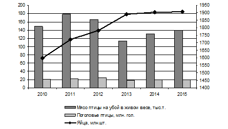 Рынок продукции птицеводства является одним из крупнейших на продовольственном рынке страны. Самообеспеченность по мясу птицы составляет 89%, а по яйцу – 92%. Производство живой массы птицы за период 2015 года составило 6,0 млн.т (44,6 % всего производства скота и птицы на убой в живом весе). В птицеводстве отмечаются самые высокие темпы наращивания, прирост производства птицы на убой составил 429,0 тыс. т или 7,7 %. Производство яиц достигает 42,5 млрд. шт., что больше предшествующего года на 1,6 %. На душу населения в настоящее время производится 290 шт. этого вида птицеводческой продукции при рациональной норме потребления - 260 шт. [3; 4].