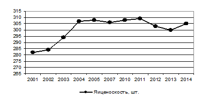 Если за период с 2001 года отмечается неустойчивая тенденция роста, то за прошедшее десятилетие не установлено положительной динамики показателя среднегодовой яйценоскости кур-несушек (рис. 2).