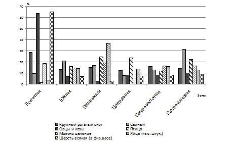 За последние десятилетие в разрезе природно-климатических зон наибольший выход продукции на 100 га сельскохозяйственных угодий установлен в центральной (63 тыс. шт/100 га) и приазовской зонах (34 тыс. шт/100 га), наименьший в восточной (3,9 тыс. шт/100 га) и северо-западной (13,3 тыс. шт/100 га). По производству мяса птицы рейтинг зон сохраняется (от 0,15 т/100 га в восточной зоне до 5,90 – в приазовской). Удельный вес природно-климатических зон Ростовской области в производстве основных видов продукции животноводства представлен на рисунке 3.