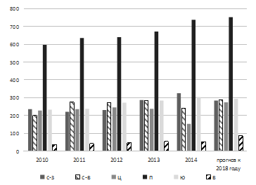 Расчет прогнозной численности поголовья сельскохозяйственных птицы к 2018 году в хозяйствах всех категорий с использованием трендовых моделей позволяет сделать вывод о положительной динамике роста основных показателей производства продукции птицеводства в Ростовской области. На рисунке 4 представлен прогноз производства яиц по природно-климатическим зонам этого региона.