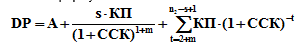 где DP – дисконтированная величина инвестиционных затрат, руб.; А – авансовый платеж, руб.; КП – величина ежегодного платежа по погашению долга, руб.; s – кратность увеличения первой выплаты; m – срок отсрочки платежей, лет; n2 – срок погашения долга, лет.