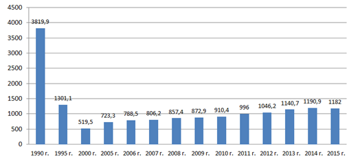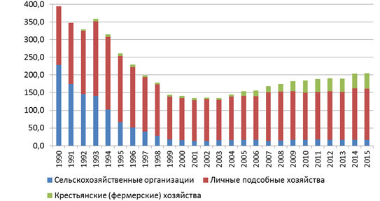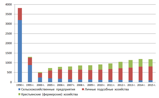 Однако, на протяжении последующих 25 лет количество овец стабильно сокращалось, причем до 2000 года более стремительными темпами и к 2015 году сократилось до 90,6 тыс. голов (рисунок 2).