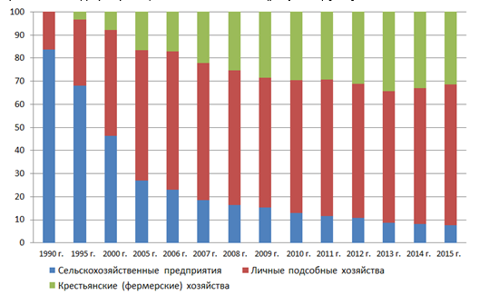 В 2015 году в сельскохозяйственных организациях было сконцентрировано всего лишь 7,7% поголовья овец и коз, в хозяйствах населения – 61,0% и крестьянских (фермерских) хозяйствах – 31,3% (рисунок 3) [2, 5].