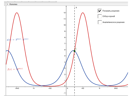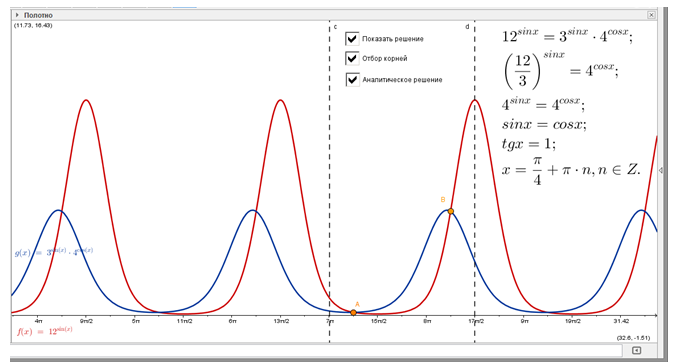 Решение и представление в виде апплета тригонометрических уравнений позволяет студентам явно увидеть процесс нахождения корней уравнения и их отбор в пределах определенного отрезка, что не представляется возможным при исключительно аналитическом решении подобных уравнений.