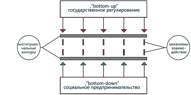 Однако стоит понимать, что, несмотря на доказанные выгоды от перехода к новым экологичным, энергоэффективным и устойчивым технологиям, мировоззрение «классического капиталиста» должно претерпеть существенные сдвиги парадигм для осознания своей роли в «зелёной» экономике, что в свою очередь требует особых информационных и иных механизмов влияния. Кроме того, существует ряд барьеров в достижении данной цели, в первую очередь, «социальные» провалы свободного рынка[2]. Если рассматривать путь развития «зелёной» экономики в рамках подходa “bottom-up” (развитие «сверху»), то стоимость стратегий, программ и проектов, финансируемых государством в данной сфере, будет увеличиваться пропорционально уменьшению движения “bottom-down” (развитие «снизу»[3]). Однако в условиях ограниченности государственного финансирования (особенно в РФ при перспективах дальнейшего секвестирования бюджета) стоит рассмотреть возможность роста «зелёной» экономики в рамках движения «снизу». Одним из перспективных ресурсов развития в данном контексте может выступать социальное предпринимательство.