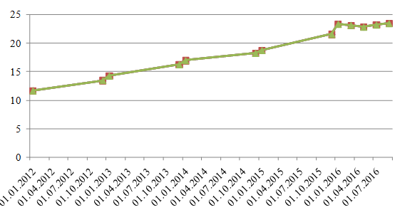 Страховые взносы едины для всех банков и уплачиваются ими ежеквартально. С III квартала 2015 г. введен механизм уплаты взносов по дифференцированным ставкам, размеры которых устанавливаются Советом директоров Агентства. Применяемая каждым банком полная ставка взносов за квартал зависит от максимального уровня процентных ставок по вкладам, привлекаемым банком. Для примера ставки на конец 2015 г. составили – 0,1 или 0,12 или 0,25% от среднего значения ежедневных остатков вкладов в банке в этом квартале. В IV квартале 2016 г. базовая ставка составила 0,12 %, базовая плюс дополнительная – 0,18% и базовая плюс повышенная дополнительная – 0,48% соответственно [4]. Причем решение диверсифицировать ставки отчислений в фонд было продиктовано желанием экономически дестимулировать банкиров неоправданно завышать ставки. Согласно принятому ранее решению, ЦБ РФ ежемесячно будет определять базовый уровень доходности вкладов по валюте и рублям как среднюю из максимальных ставок по вкладам в банках, привлекших в совокупности две трети общего объема вкладов. При превышении этого уровня не более чем на 2% он будет платить только базовую ставку. В случае если хотя бы по одному вкладу есть превышение от 2 до 3%, платится дополнительная ставка, если более чем на 3% - дополнительная повышенная.