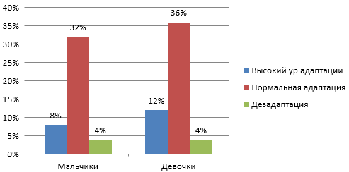 По выше представленным результатам видно, что наибольшее количество испытуемых имеют нормальный уровень адаптации, 5 человек, из них 2 мальчика и 3 девочки оказались на высоком уровне адаптации и один мальчик и девочка дезадаптированы.