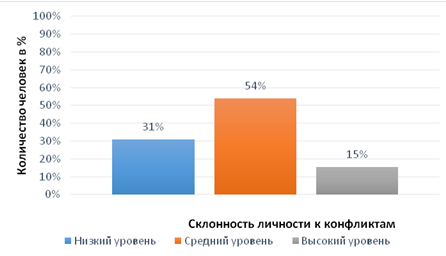 Результаты исследования указывают на преобладание склонности личность к конфликту на среднем уровне - 54%. Испытуемые способны уверенно демонстрировать свою позицию, независимо от того, какие последствия это повлечет для деловых и личных отношений.