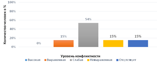 Уровни конфликтности: выраженная, невыраженная, отсутствие представлены в равной степени - 15%. Высокий уровень конфликтности не выявлен.