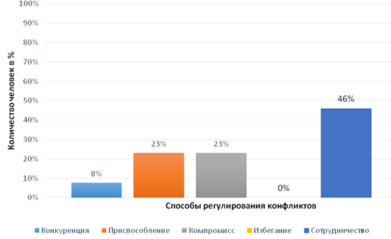 Исследование показало, что в исследуемой выборке с наибольшей частотой применяется такая стратегия конфликтного поведения как сотрудничество - 46%. Сотрудники полиции, применяя данную стратегию, активно участвуют в разрешении конфликта и отстаивают как свои интересы, так и другого человека, реализуя совместную деятельность.