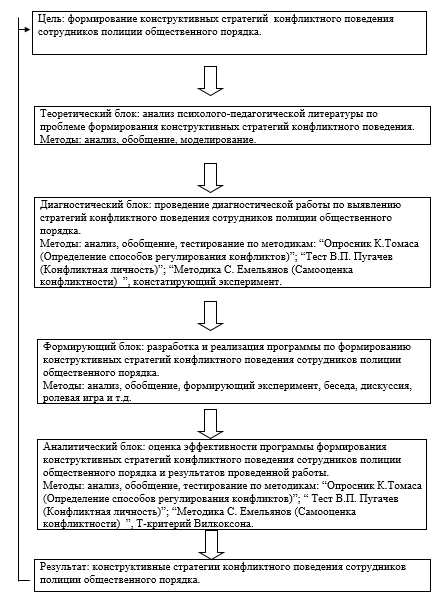 Теоретический блок включает постановку цели, подборку методов и методик, анализ литературы по формированию конструктивных стратегий конфликтного поведения сотрудников полиции общественного порядка.