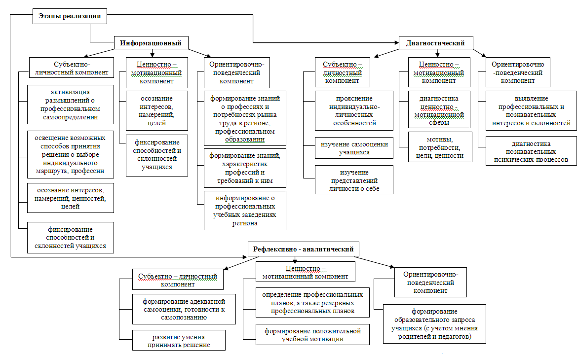 Интеграция этих компонентов в профориентационной деятельности старшеклассников позволяет сформировать у них социально-психологические механизмы перцепции, рефлексии, способности к выбору. В целях выработки этих механизмов направлено содержание программы, включающей специальные занятия для учащихся с учетом их особенностей и результатов диагностики [2].