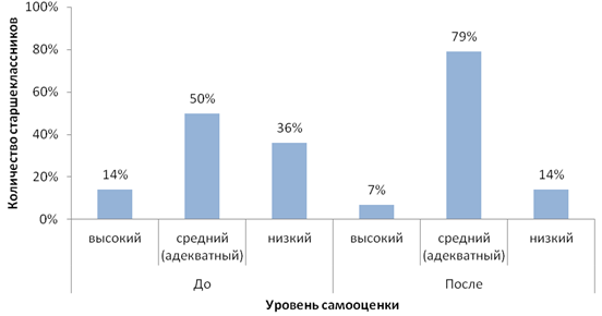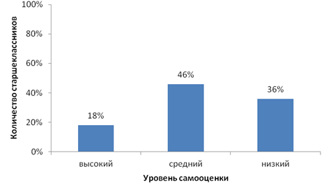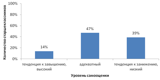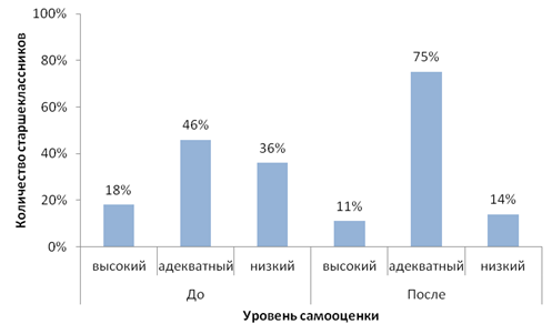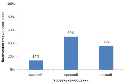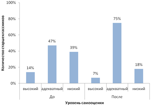 По результатам первичной диагностики с помощью методики Т.В. Дембо-С.Я. Рубинштейна, мод. А.М. Прихожан выявлено, что у 47% (13) учеников адекватная самооценка, она отражает наиболее реальное представление о своих возможностях; у 14% (4) учеников завышенный уровень самооценки демонстрирует неумение реально оценить результаты выполняемой деятельности, объективно сопоставлять себя с другими людьми; данная самооценка может указывать на тенденцию в «закрытости для опыта», индифферентности к принятию своих ошибок и неудач; 39% (11) старшеклассников показали заниженную самооценку, которая свидетельствует о неуверенности в себе, своих действиях, и понимании отсутствия личных способностей.